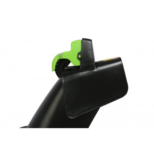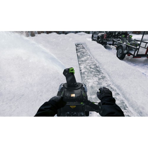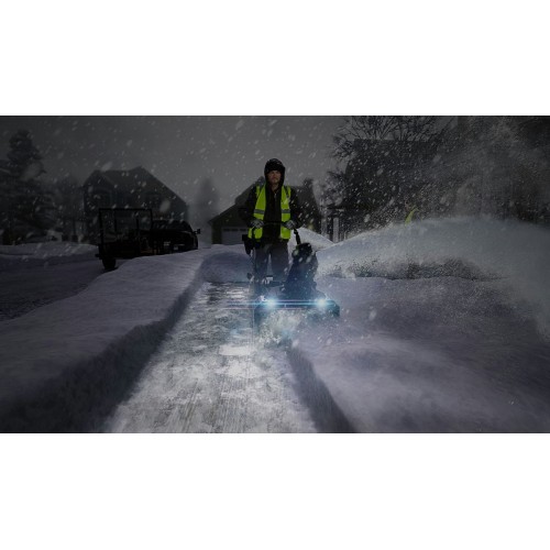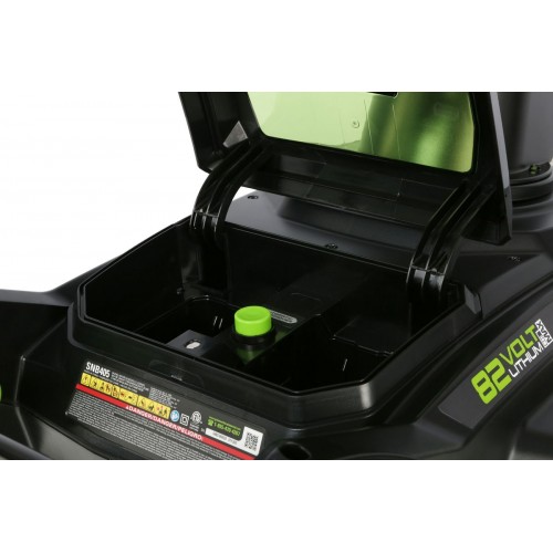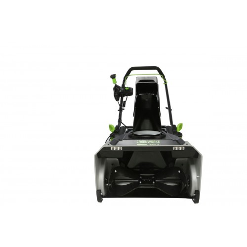 Для безопасного включения предусмотрена кнопка-предохранитель, как и на всей аккумуляторной технике Greenworks. Ручка имеет складную конструкцию. Снегоуборщик работает от аккумуляторной батареи 82V (2,5 или 5 Ампер/час), которую можно использовать с другими с устройствами Greenworks из линейки 82V.
