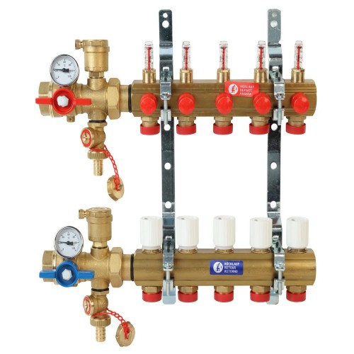 Комплект коллекторов с многофункциональными кранами, предварительно собранный, с расходомерами (0,5-5 л/мин.). Латунный. Для подключения трубы медной, пластиковой, металлопластиковой, использовать соответствующие адаптеры. C кронштейнами R588 для установки в шкафу R500 (или R588Z для шкафов R500-2).