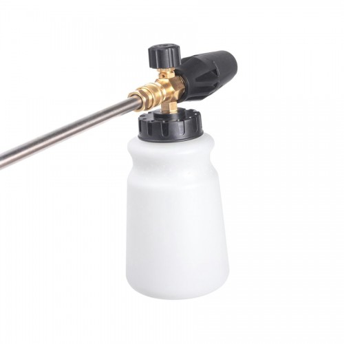 Шланг (8 м), форсунка для пеногенератора, всасывающий шланг с коннектором, пеногенератор, моющий пистолет и сменные форсунки (0°,25°,40°) в комплекте.