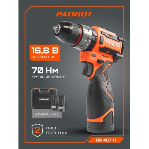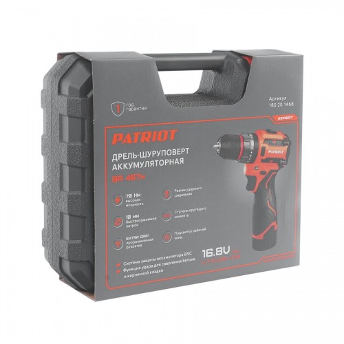 Дрель-шуруповерт PATRIOT BR 467 H для работ в квартире и на даче, в личной мастерской. Для сборки мебели, ремонта компьютерной техники, работы с крепежом и сверления отверстий в различных типах материалов. Два аккумулятора и зарядное устройство в комплекте. Вместительный и удобный кейс.