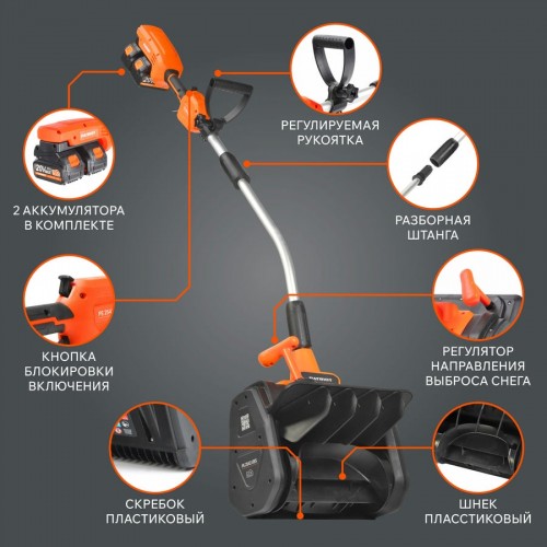 Средняя продолжительность работы снегоуборщика на двух аккумуляторах — до 20 минут. Электрический двигатель мощностью 0,85 кВт. Максимальная частота вращения шнека 1800 об/мин.
