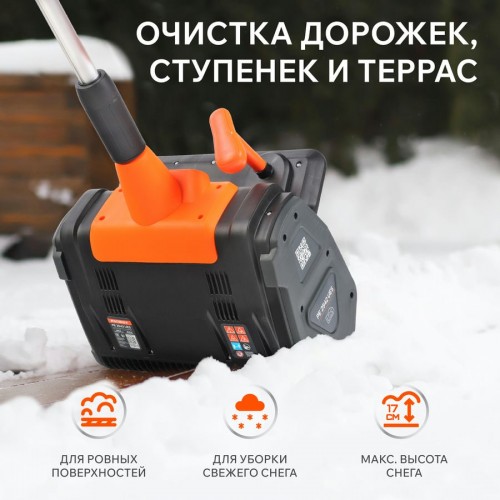 Для эксплуатации на ровных поверхностях со свежим рыхлым снегом, высотой до 27 см. Очистит небольшую площадь до 20м2. Имеет одноступенчатый шнек (диаметр 13 см) из армированного пластика и ковш (36,5х27 см). Подойдет для работы на площадке с декоративным покрытием или садовых дорожках. Работает на двух одновременно подключённых аккумуляторах системы UES.