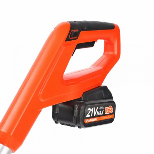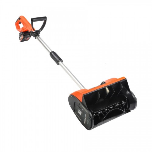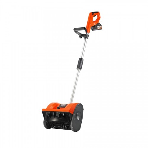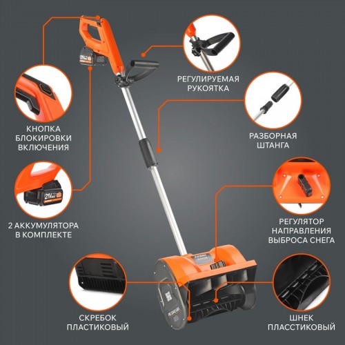 Одноступенчатый шнек (диаметр 11 см) из армированного пластика и удобный ковш (ширина 33 см). Корпус из ударопрочного ABS-пластика. Работа от литий-ионного аккумулятора единой аккумуляторной платформы UES до 20 минут. Время зарядки аккумулятора до 2 часов. Небольшие габариты и складная рукоять упрощают хранение.