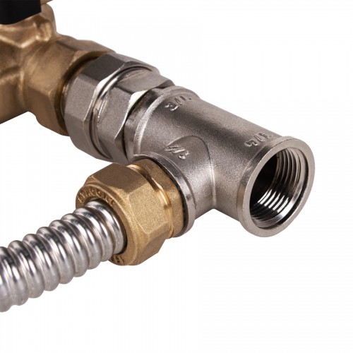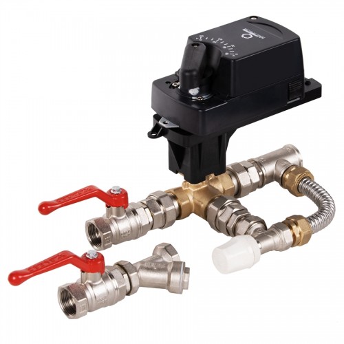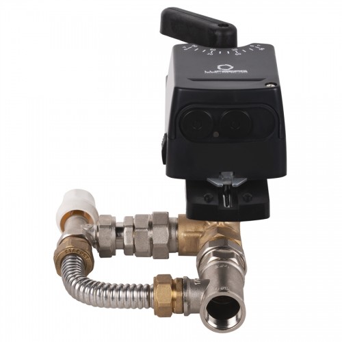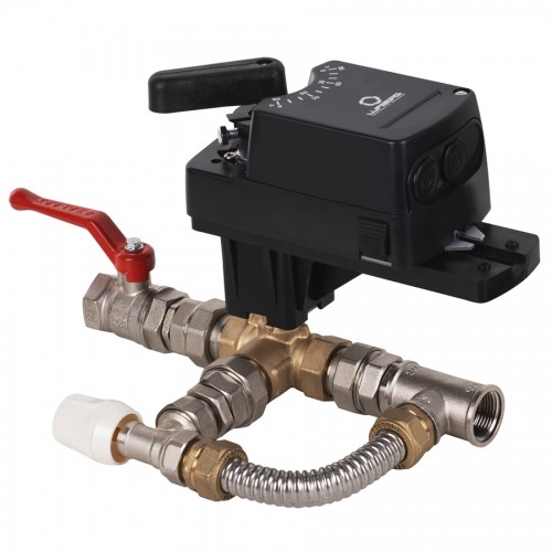 Смесительный узел для подключения воздушных завес с водяным теплообменником к системе отопления. Благодаря встроенному электромагнитному клапану узел в автоматическом режиме контролирует проток теплоносителя через теплообменник завесы тем самым регулирует ее тепловую мощность и температуру помещения.