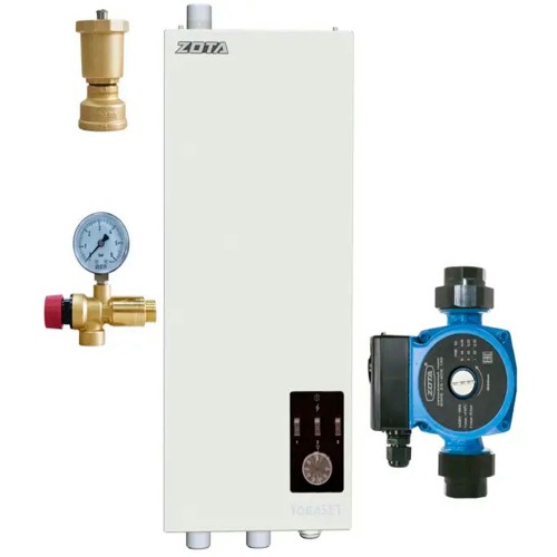 Электрический котел Zota YOGASET — больше чем электрокотел, это целая мини-котельная, предназначенная для эксплуатации в системах отопления. Сборное изделие, в состав которого входят – электрический котел, циркуляционный насос, предохранительный клапан, воздухоотводчик и манометр. Данное комплексное решение делает компактным не только сам котел, но и обвязку системы отопления в целом, что позволяет сэкономить место в помещении, и легко установить даже в небольших котельных. Котел устанавливается на стену и подключается к электросети напряжением 220/380. Одной из главных отличительных особенностей котла от всех прочих является наличие трех соединительных патрубков вместо двух, что делает котел самым уникальным на рынке с точки зрения универсальности и удобства врезки в систему отопления. Термостат с датчиком температуры теплоносителя гильзованным внутрь колбы котла обеспечивают высокую точность поддержания заданной температуры теплоносителя в диапазоне от 25 до 85 градусов. Колодка внешнего термостата позволяет эксплуатировать котел не только по температуре теплоносителя, но и по комнатной температуре – что существенно увеличит условия комфорта, а также до 30% дополнительно снизит расход электроэнергии на отопление. Модель обладает высокой надежностью. Во-первых, у котла имеется резервный самовозвратный датчик перегрева теплоносителя, срабатывающий на 95 градусах, во-вторых, установлен надежный электромагнитный пускатель на 25А, встроенный в цепь питания котла и, в-третьих, дополнительный предохранитель для защиты цепи питания котла.