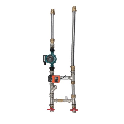Циркуляционный насос предназначен для преодоления потерь в смесительном узле и на теплообменнике Байпас c обратным клапаном и балансировочным вентилем необходим для выравнивания давления, чтобы не допустить изменения расхода воды через теплообменник Балансировочный кран обеспечивает оптимальную потерю давления на байпасе Обратный клапан предотвращает перетикание обратного теплоносителя в подающую линию Отсечные шаровые краны облегчают обслуживание Фильтр грубой очистки увеличивает ресурс службы смесительного узла Гибкие подводки облегчают монтажРегулирование мощности нагревателя осуществляется изменением температуры входящего теплоносителя при смешивании прямого и обратного теплоносителя на трехходовом клапане с электроприводом.