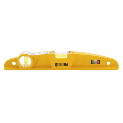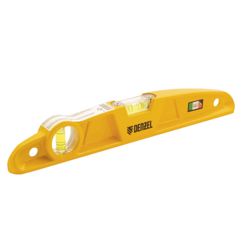 Литой магнитный уровень Denzel 34920 длиной 300 мм, с 2 глазками, поможет создать ровные линии в горизонтальной и вертикальной плоскостях. Строительный уровень обеспечивает высокоточную работу и используется при укладке напольной и настенной плитки, выравнивании кирпичной кладки, брусчатки и т.д.;Для определения отклонения вертикали 90 градусов необходимо использовать пузырьковую ампулу только в верхнем положении уровня. Только базовая поверхность является рабочей (противоположная ампуле 180 градусов).