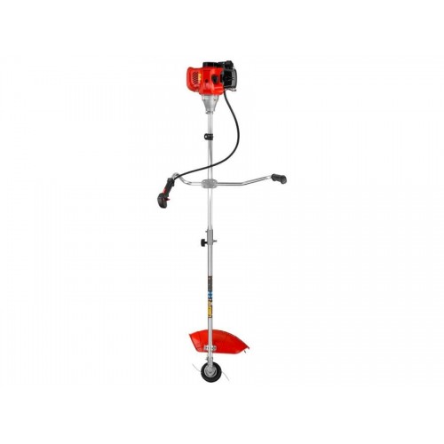 Мощная модель для продвинутых пользователей, которые по достоинству оценят внушительный потенциал мотокосы. Удобная и эргономичная рукоятка триммера изготовлена в виде велосипедного руля и может устанавливаться в различных положениях, это обеспечивает максимальную управляемость и уменьшает нагрузку на опорно-двигательный аппарат оператора. Блок управления находится на одной ручке, кнопки доступны и располагаются точно под пальцами оператора. Разборная штанга изготовлена из легкого алюминия, что повышает прочность конструкции, снижая её вес. Штанга оснащена антивибрационными демпферами, поглощающими вибрацию и уменьшающими нагрузку на кисти и предплечья. Жесткий приводной вал дает возможность использовать в работе нож или диск. Конический редуктор имеет избыточный запас прочности и способен выдерживать большие нагрузки. При этом редуктор легко отсоединяется, что позволяет использовать двигатель мотокосы в качестве силового агрегата. Топливный бак имеет полупрозрачные стенки для удобства контроля за уровнем топлива. Мотокоса снабжена праймером для предварительной подкачки топлива, который облегчит запуск мотора. Корпус двигателя выполнен из специального ударопрочного пластика и защищает от внешних механических воздействий. Широкий защитный кожух защищает оператора от выброса травы, камней и других вылетающих из-под режущего инструмента предметов. Надёжная полуавтоматическая катушка обеспечивает лёгкую подачу корда. Прочный трёхлопасной нож с лёгкостью справится с дикорастущей травой и кустарником. Два поршневых кольца создают стабильную компрессию, увеличивают срок службы цилиндро-поршневой группы.