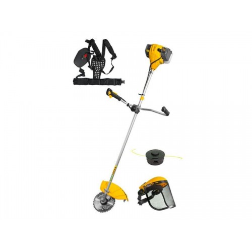 ■ Функциональность и эргономика ■ - Многофункциональная и эргономичная рукоятка велосипедного типа с прорезиненными ручками ■ - Удобный плечевой ремень рюкзачного типа ■ - Регулируемый угол наклона и поворота рукоятки управления ■ - Эффективная антивибрационная система ■ - Праймер (система лёгкого запуска) ■ - Топливный бак увеличенного объема с прозрачными стенками ■ Надёжность конструкции ■ - Цельносоставная удлинительная штанга из легкого алюминия ■ - Цельнометаллический приводной вал ■ - Два поршневых кольца для высокой компрессии. ■ - Отсоединяемый редуктор повышенной прочности ■ - Ударопрочный корпус двигателя из полиамида ■ - Комбинированный защитный кожух из прочного пластика ■ - Ротационный карбюратор ■ - Усиленная полуавтоматическая косильная катушка с леской ■ - Облегчённый 40-зубый пильный диск с победитовыми напайками ■ - Сетчатая защитная маска ■ ■ Удобная и эргономичная рукоятка триммера изготовлена в виде велосипедного руля и может устанавливаться в различных положениях, это обеспечивает максимальную управляемость и уменьшает нагрузку на опорно-двигательный аппарат оператора. Блок управления находится на одной ручке, кнопки доступны и располагаются точно под пальцами оператора. ■ Плечевой ремень рюкзачного типа равномерно распределяет нагрузку на плечи, спину и поясницу оператора, не ограничивая движений. ■ Регулировка угла наклона и поворота рукоятки управления очень простая - достаточно ослабить один регулировочный винт. ■ Штанга оснащена антивибрационными демпферами, поглощающими вибрацию и уменьшающими нагрузку на кисти и предплечья. ■ Мотокоса снабжена праймером для предварительной подкачки топлива, который облегчит запуск мотора. ■ Топливный бак увеличенного объема имеет полупрозрачные стенки для удобства контроля за уровнем топлива. ■ Цельносоставная штанга изготовлена из легкого алюминия, что повышает прочность конструкции, снижая её вес. ■ Жесткий приводной вал дает возможность использовать в работе нож или фрезу. ■ Два поршневых кольца создают стабильную компрессию, увеличивают срок службы цилиндро-поршневой группы. ■ Конический редуктор имеет избыточный запас прочности и способен выдерживать большие нагрузки. При этом редуктор легко отсоединяется, что позволяет использовать двигатель мотокосы в качестве силового агрегата. ■ Корпус двигателя выполнен из специального ударопрочного пластика (полиамида) и защищает от внешних механических воздействий. ■ Широкий защитный кожух защищает оператора от выброса травы, камней и других вылетающих из-под режущего инструмента предметов. ■ Карбюратор ротационного типа, работает в любых положениях. ■ Надёжная полуавтоматическая катушка обеспечивает лёгкую подачу корда. ■ Пильный диск имеет специальный профиль режущих зубьев с твердосплавными напайками и имеет повышенную устойчивость к ударам о твердые предметы. Предназначен для обрезки низкорастущих веток кустарника. ■ Мотокоса комплектуется сетчатой защитной маской для дополнительной защиты глаз. Металлическая сетка покрытой чёрной краской для уменьшения отражения и предотвращения коррозии. Маска имеет широкий диапазон регулировок. ■Высокотехнологичная модель мотокосы для длительной работы с максимальной мощностью, обладает исключительной надёжностью 