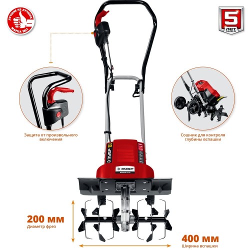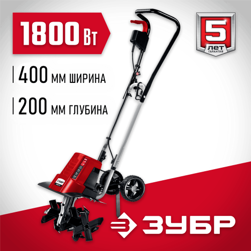Культиватор электрический ЗУБР ККД-1800, предназначен для рыхления и культивации почвы на небольшом участках, парниках и теплицах. Оснащен металлическими фрезами с шириной захвата 40 см и обрабатывает почву на глубину до 20 см. Транспортировочные колеса позволяет с легкостью перевозить культиватор по участку. Cошник надежно фиксируется к раме культиватора и отвечает за регулировку глубины вспашки и простоту эксплуатации. На корпусе предусмотрен щиток, который защищает оператора от попадания земли. Закаленные фрезы прекрасно закапываются на полную глубину и способствуют продвижению культиватора вперед.