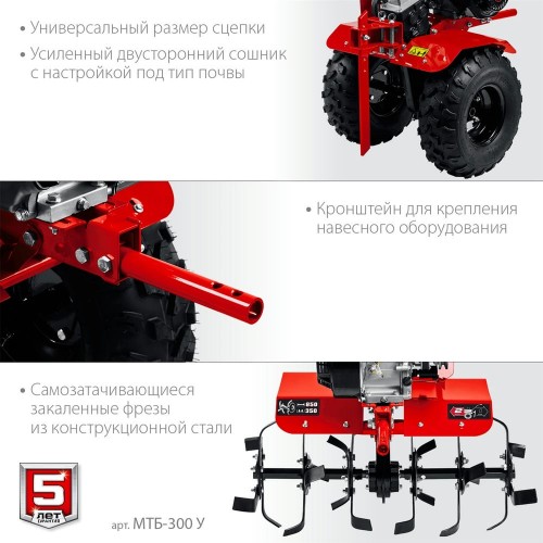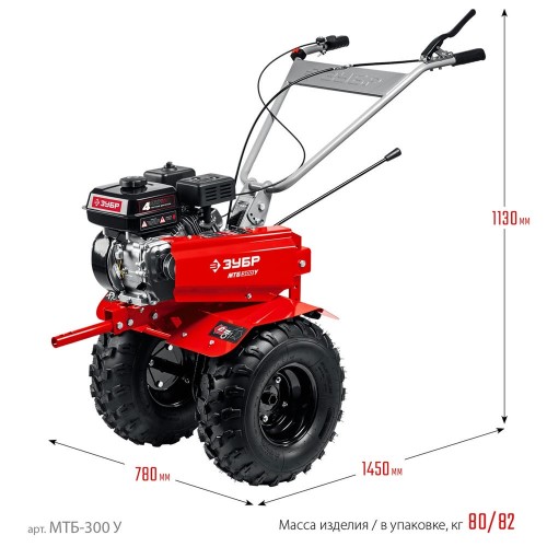 Мотоблок бензиновый ЗУБР МТБ-300 У предназначен для рыхления и культивации почвы на приусадебном участке. Эффективный двигатель с воздушным фильтром в масляной ванне увеличивает моторесурс. Кронштейн для крепления навесного оборудования (диаметр 30 мм) и шкив отбора мощности позволяют использовать широкую гамму навесного оборудования: снегоуборщик, щетку, роторную косилку. 2 скорости вперед (основная и повышающая) и 1 назад позволяют комфортно работать на любых типах почвы. Чугунный шестеренчато-цепной редуктор с закаленной шестигранной осью 23 мм. Рукоять мотоблока с возможностью регулировки по вертикали делает управление более комфортным. Закаленные фрезы прекрасно закапываются на полную глубину и способствуют продвижению мотоблока вперед. Большие пневматические колеса обеспечивают отличную проходимость. Обратите внимание, что c 07.2021 сошник поставляется без транспортировочных колес. Аксессуары