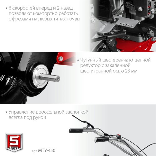 Мотоблок ЗУБР МТУ-450, предназначен для рыхления и культивации почвы на приусадебном участке. Дополнительный шкив для активного навесного оборудования. Щиток на корпусе защищает оператора от попадания земли. Алюминиевый шестеренчатоцепной редуктор с закаленной шестигранной осью 23 мм. Управление дроссельной заслонкой всегда под рукой. Возможность вертикальной регулировки руля для более комфортного управления. 6 скоростей вперед и 2 назад позволяют комфортно работать с фрезами на любых типах почвы. Универсальный размер сцепки. Двусторонний сошник с возможностью настройки под тип почвы. Аксессуары