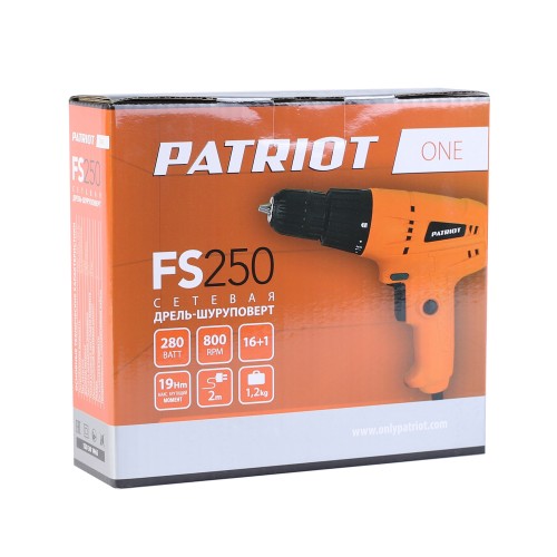Электрическая дрель-шуруповерт Patriot FS 250, 1 скор., мощность 280 Вт, макс. крутящий момент 19 Нм, быстрозажимной патрон