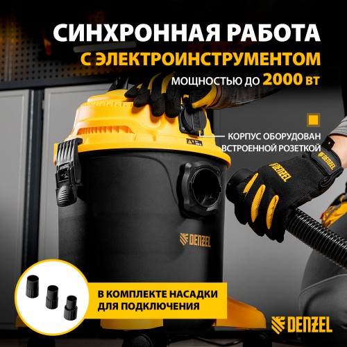 Пылесос строительный DENZEL LVC20, 1400 Вт, бак 20 л, шланг 3 м, розетка с автосинхр.