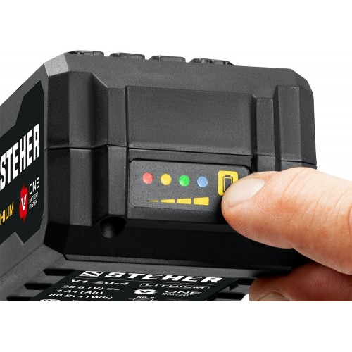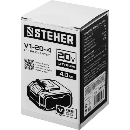 Аккумуляторная батарея STEHER V1-20-4, предназначена для питания аккумуляторного инструмента (CD-200, CDB-200, CDS-200, CWB-300, CSB-300). Мощность и производительность в компактном исполнении. Литий-ионная технология аккумуляторной батареи: максимальное напряжение заряженной батареи достигает 20В. Высокая производительность, электронная система защиты от перегрузки, перегрева и глубокой разрядки. Отсутствие эффекта памяти, отсутствие потери мощности в процессе работы и увеличенная до 4.0 Ач емкость батареи для длительной работы. Защита от перегрева, глубокой разрядки и перегрузки. Более 500 циклов заряда / разряда. Возможность зарядки на БЗУ. Ударопрочный корпус из ABS пластика. Возможна зарядка в любое время.