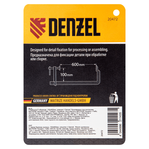 Струбцина DENZEL F-образная, 100x600мм, кованая