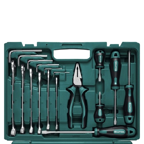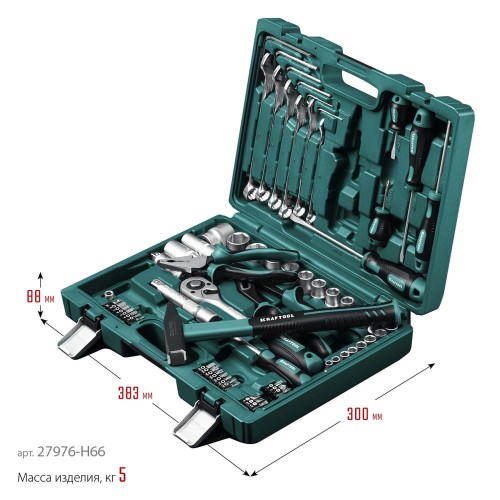 Универсальный набор инструмента KRAFTOOL 27976-H66_z01, предназначен для широкого спектра слесарно-монтажных и ремонтных работ. Многоступенчатая закалка для придания баланса прочности и твердости. Хромированное покрытие для защиты от коррозии. Обладает высоким ресурсом даже при интенсивных работах. В комплект входит: