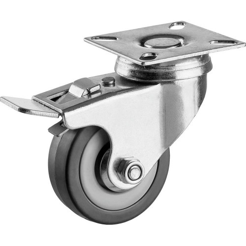 Колесо поворотное c тормозом ЗУБР 30956-50-B применяются для перемещения тележек и легковесного оборудования. Рекомендуется для полов с неровностями и препятствиями, а также для использования внутри помещений и на улице. Колесные опоры обеспечивают удобное перемещение тележек и контейнеров легкой и стандартной грузоподъемности, легковесного оборудования, строительных лесов и прочих конструкций. Благодаря износостойким материалам колесные опоры находят применение как в помещениях, так и вне их. Крепежная платформа свободно вращается благодаря шариковому подшипнику. Могут использоваться в условиях повышенной влажности и слабых кислот. Стальной штампованный диск обеспечивает повышенную прочность. Игольчатый подшипник обеспечивает легкость вращения колеса. Специальная прокладка предотвращает попадание пыли в полость шарикового подшипника на опоре. Наличие педали тормоза обеспечивает возможность блокировки колеса в любом положении. Цинковое покрытие надежно защищает изделие от коррозии.