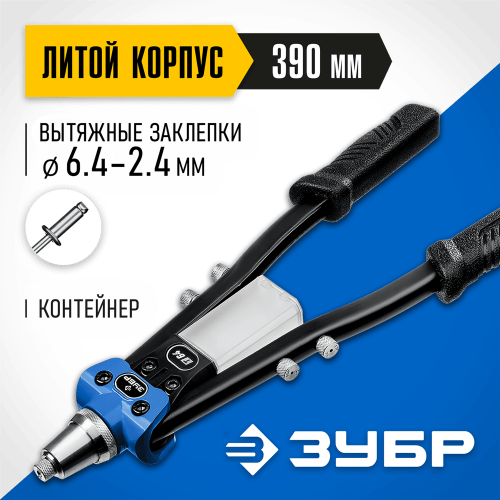 ЗУБР заклепки 2.4-6.4 мм из алюминия, стали, нерж. стали, усиленный литой корпус, заклепочник двуручный Т-64 311971 Профессионал
