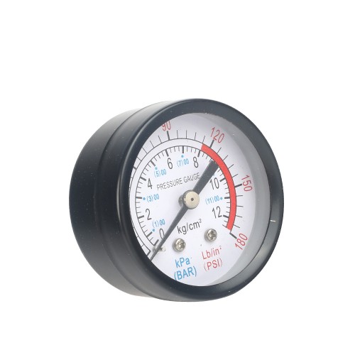 Манометр PATRIOT 780/2 для измерения давления сжатого воздуха в пневмоинструментах с диапазоном 0-12 бар. Монтаж осуществляется с помощью резьбы 1/4 дюйма с применением клея-герметика. Показания отображаются в барах и PSI.