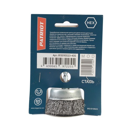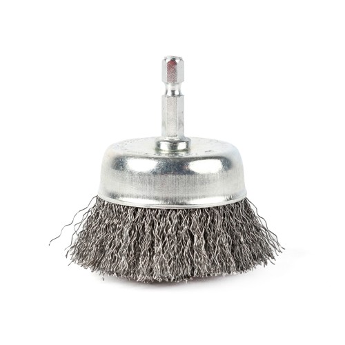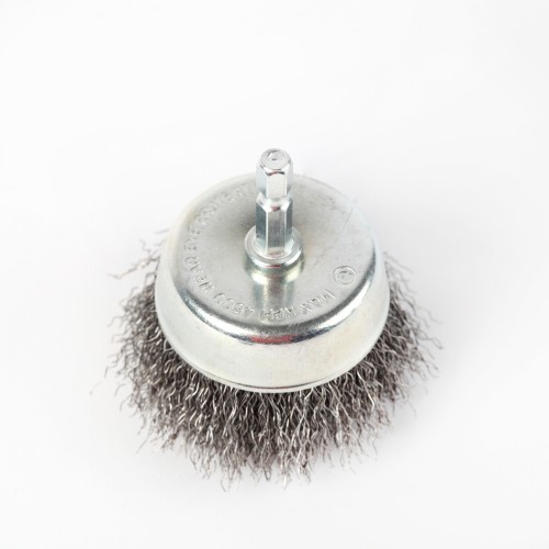 чашеобразная проволочная щетка для дрели; предназначена для снятия лака; краски; зачистки ржавчины; Наружный диаметр: 65мм; вал шестигранник; гофрированная проволока