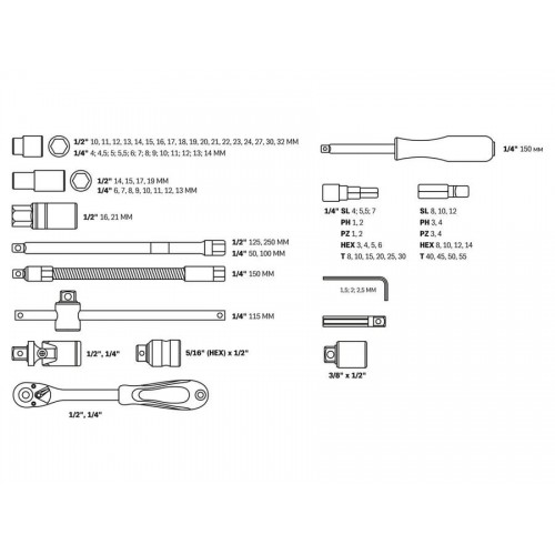 + Головка торцевая 14: 4, 4.5, 5, 5.5, 6, 7, 8, 9, 10, 11, 12, 13, 14 мм; + Головка торцевая длинная 14: 6, 7, 8, 9, 10, 11, 12, 13 мм; + Головка с насадкой HEX 14: H3, H4, H5, H6; + Головка с насадкой TORX 14: T8, T10, T15, T20, T25, T30; + Головка с насадкой SL 14: SL4, SL5.5, SL7; + Головка с насадкой PH 14: PH1, PH2; + Головка с насадкой PZ 14: PZ1, PZ2; + Головка торцевая 12: 10, 11, 12, 13, 14, 15, 16, 17, 18, 19, 20, 21, 22, 23, 24, 27, 30, 32 мм; + Головка торцевая длинная 12: 14, 15, 17, 19, 22 мм; + Свечная головка 12: 16, 21 мм; + Насадка 516 HEX: H8, H10, H12, H14; + Насадка 516 TORX: T40, T45, T50, T55; + Насадка 516 SL: SL8, SL10, SL12; + Насадка 516 PH: PH3, PH4; + Насадка 516 PZ: PZ3, PZ4; + Трещотка 14; + Переходник 14 под шуруповерт; + Удлинитель 14 50 мм; + Удлинитель 14 100 мм; + Кардан 14; + Вороток-отвертка 14 150 мм; + Вороток 14 с плавающей головкой 115 мм; + Гибкий удлинитель 14; + Трещотка 12; + Переходник (держатель для бит) 12х516(HEX); + Удлинитель 12 125 мм; + Удлинитель 12 250 мм; + Кардан 12; + Переходник 38х12 с отверстием; + Ключ шестигранный Г-обр.: 1.5, 2, 2.5 мм; + Кейс