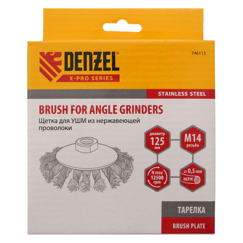 Щетка для УШМ Denzel «Тарелка» 746113, 125 мм, М14, с щетиной из крученой нержавеющей проволоки 0,5 мм, предназначена для снятия толстого слоя краски, лака, ржавчины, для удаления заусенцев и окалины, зачистки сварных швов. Щеткой обрабатывают твердые, преимущественно металлические поверхности, в том числе из нержавеющей стали. Она удобна для очистки как плоских изделий, так и внутренних углов, пазов, изгибов. Щетка совместима с углошлифовальными машинами, поддерживающими работу на скорости до 12500 об/мин. Во время работы необходимо использовать средства индивидуальной защиты. Щетка пригодится во время строительства, на производстве, а также будет полезна в быту.