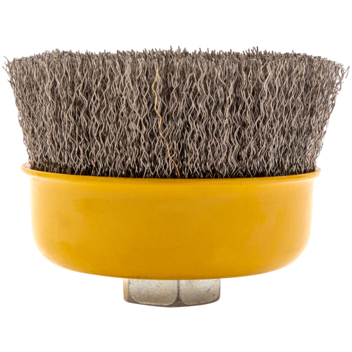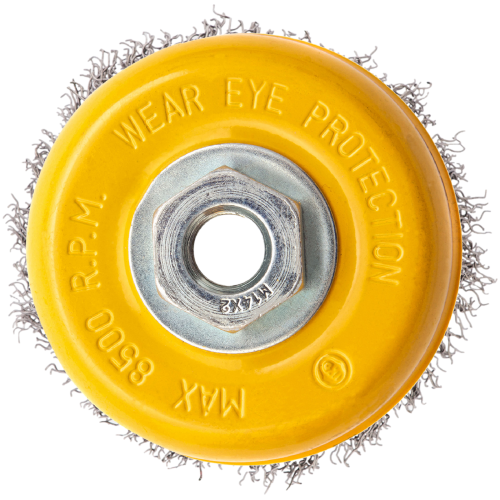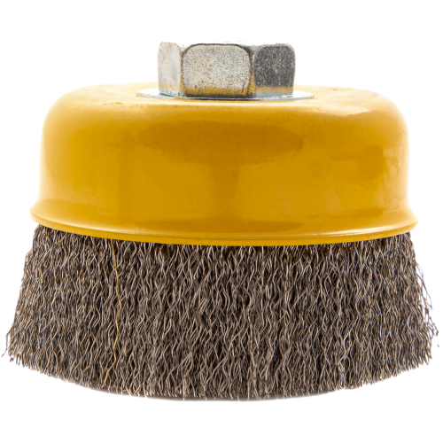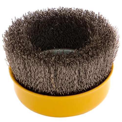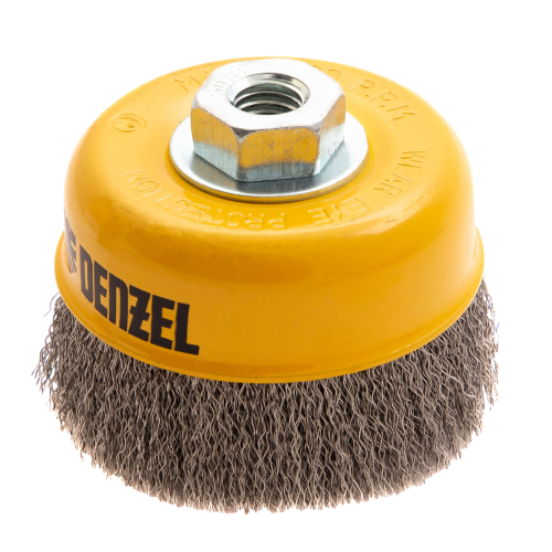 Щетка для УШМ «Чашка» Denzel 746053, М14, диаметром 100 мм, с щетиной из витой нержавеющей проволоки диаметром 0,3 мм, позволяет быстро и аккуратно очистить металлическую, деревянную или пластиковую поверхность от незначительных загрязнений и ржавчины, а также удалить остатки лакокрасочных материалов, сделать поверхность шероховатой или матовой. Насадка подходит для очистки плоских участков большой площади. Поскольку щетина выполнена из нержавеющей стали, щетку можно использовать для обработки изделий из нержавейки. Щетка устанавливается на вал углошлифовальной машины (УШМ) и предназначена для работы с максимальной скоростью 8500 об/мин. Во время работы обязательно соблюдение техники безопасности и использование средств индивидуальной защиты. Щетку применяют в строительстве, на производстве, а также в быту.
