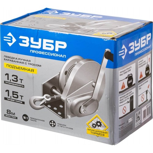 ЗУБР 1,3 т, 8 м, подъемная, тросовая, лебедка ручная барабанная 43117-1.3 Профессионал