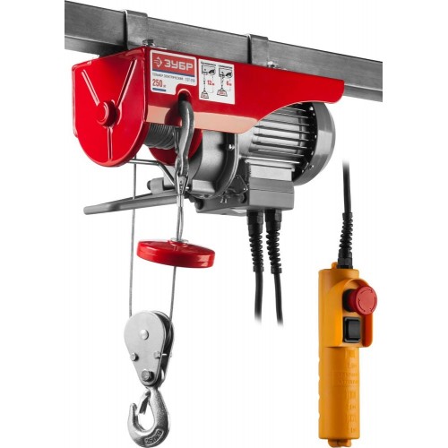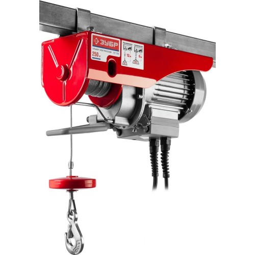 Тельфер электрический ЗУБР ЗЭТ-250, предназначен для подъема, опускания и перемещения (в пределах перемещения кран-балки) грузов в производственных помещениях, складах, гаражах и на строительных площадках. Два режима работы - удвоенный вес или двойная скорость. Оптимален для гаража, мастерской, загородного дома. Возможна работа в режиме с полиспастом. В этом режиме подъемный вес увеличивается в два раза. Защита от перегрузки при превышении подъемного веса. Система остановки при максимальных подъеме и опускании. Подъем и опускание осуществляются только при нажатых кнопках. Выносной пульт для максимального удаления оператора от поднимаемого груза. Кнопка экстренной остановки в случае неисправности. Защитное заземление. Надежный тормозной механизм, обеспечивающий удержание поднятого груза. Конструкция с асинхронным двигателем, не требующим обслуживания в процессе эксплуатации.