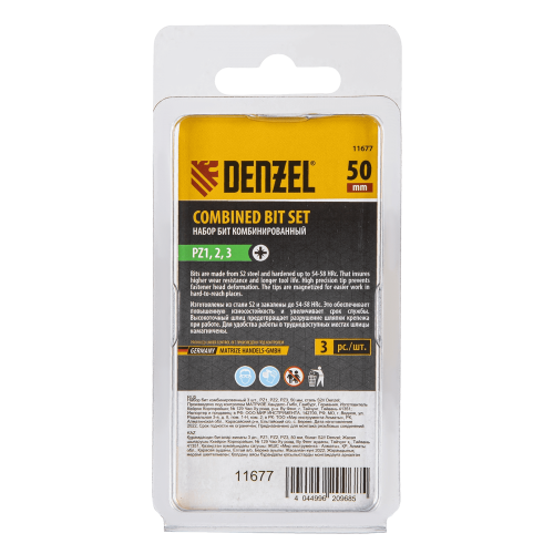 Набор бит комбинированный DENZEL 3 шт., PZ1, PZ2, PZ3, 50 мм, сталь S2