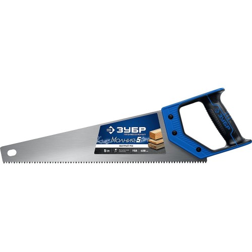 Ножовка по дереву (пила) МОЛНИЯ 5 15075-40_z02, применяется для поперечного распила крупных и средних заготовок мягкой и твердой древесины. Двухкомпонентная эргономичная рукоятка. Импульсная закалка каждого зуба: высокая твердость и предотвращение выкрашивания. Утолщенное полотно из высококачественной стали У8А для идеально прямого реза.