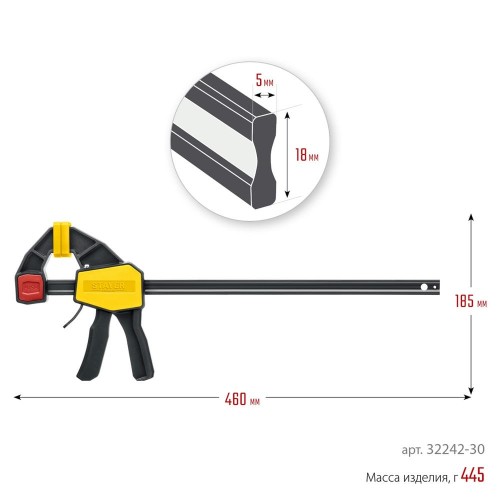 Струбцина быстрозажимная STAYER 32242-30_z01, предназначена для фиксации заготовок при выполнении столярных и слесарных работ. Индукционная закалка направляющей рейки. Рейка с двутавровым профилем. Большой надежный стальной рычаг для быстрого снятия струбцины. Работа одной рукой: зажим или сброс сжатия производиться быстро и без особых усилий. Иновационная кнопка-держатель для быстрой перестановки прижимной губки. Удобный эргономичные ручки армированы фиберглассом, защищены от излома.