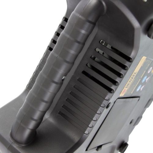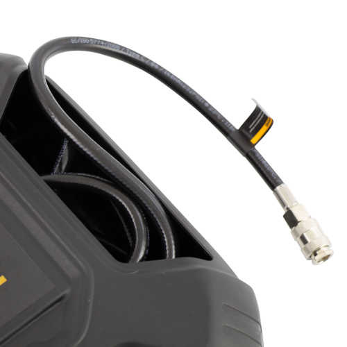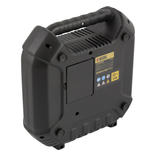 - Легкость перемещения — ребристая транспортировочная ручка делает переноску кейса-компрессора простой и удобной.