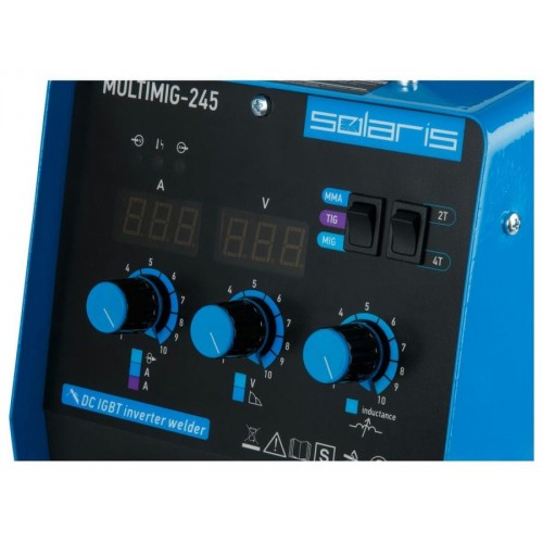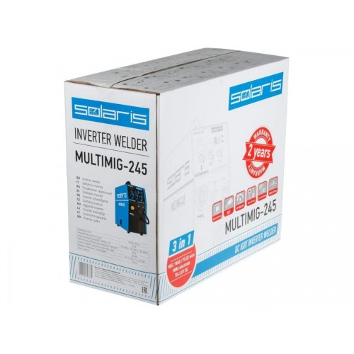 Полуавтомат сварочный Solaris MULTIMIG-245 (230В; MIG/FLUX/MMA/TIG; евроразъем; горелка 3 м; смена полярности; 2T/4T; рег-ка индуктивн.)