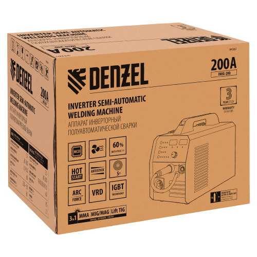 Аппарат инвертор. полуавтомат. cварки DENZEL IMIG-200, 200 А, ПВ 60%, катушка 5 кг