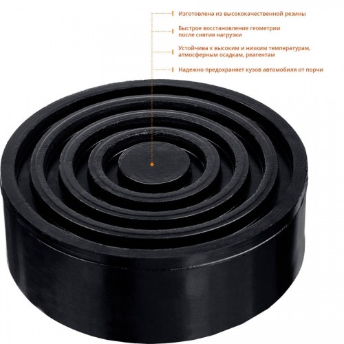 Опора резиновая для домкрата ЗУБР 43005-35, надежно предохраняет возможную порчу ТС при использовании подъемного устройства. Устойчива к высоким и низким температурам, атмосферным осадкам (вода, снег и т.п.). Устойчивое восстановление после снятия нагрузки (минимальное изменение геометрии после длительного сжатия).