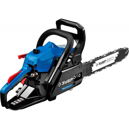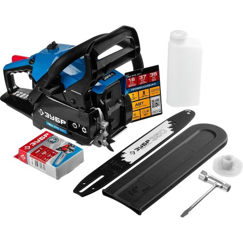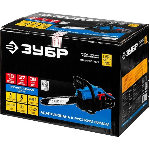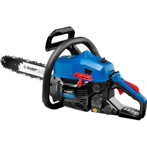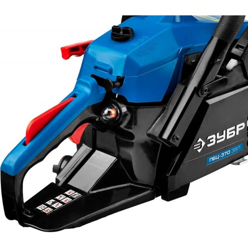 Пила цепная бензиновая ЗУБР ПБЦ-370 35П, предназначена для пиления досок, бруса, стволов различных пород дерева (с приводом режущего инструмента от двигателя внутреннего сгорания). Изделие предназначено для эксплуатации только вне помещений. Легкая, компактная пила для садового участка. Высокая надежность двигателя обеспечивается двумя компрессионными кольцами и хромированием цилиндра. Насос подкачки топлива способствует более легкому запуску, даже в холодную погоду. Антивибрационная система, выполненная по профессиональной схеме, эффективно снижает возникающую вибрацию. Электронная система зажигания обеспечивает ровную, экономичную и экологичную работу двигателя. Автоматическая система смазки цепи дозированно подает масло, в зависимости от нагрузки и отключает подачу масло на холостых оборотах. Основной тормоз мгновенного действия и вспомогательный инерционный тормоз, управляемый клавишей на рукоятке обеспечивают высокую безопасность работ.