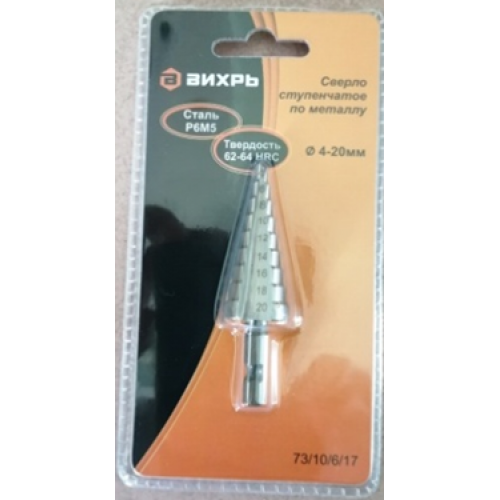• Сверло ступенчатое по металлу 4-6-8-10-12-14-16-18-20мм, P6M5, шестигранный хвостовик Вихрь