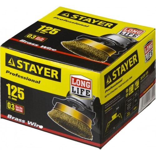 Щетка крацовка чашечная для УШМ STAYER 35125-125, предназначена для зачистки поверхностей от лакокрасочных покрытий, ржавчины, окалины и различных загрязнений с поверхностей изделий из стали и цветных металлов. Щетка изготовлена из латунированной витой проволоки. Латунированное покрытие защищает рабочую часть щетки от коррозии. Витая форма проволоки позволяет обрабатывать поверхности без повреждений. Каждая щетка крацовка STAYER соответствует действующим стандартам качества и обеспечивает безопасную работу в указанном диапазоне оборотов.