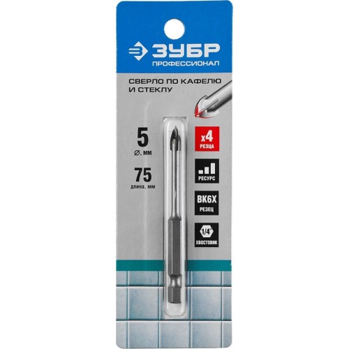 ЗУБР 5 мм, 4-х резцовый, длина 75 мм, шестигранный хвостовик, сверло по стеклу и кафелю 29845-05_z01