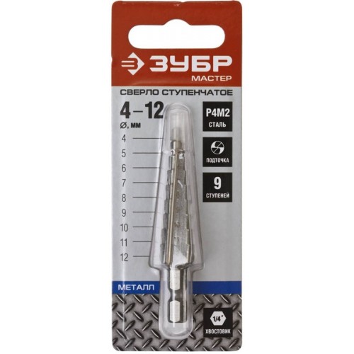 Сверло Зубр 29665-4-12-9, предназначено для сверления металлических конструкций и заготовок, листовых материалов, цветных металлов, пластика. Множество диаметров в одном сверле для сверления различных листовых материалов. Крестообразная подточка позволяет начать сверление без предварительных работ. Угол заточки при вершине равный 135° для ускорения процесса сверления. Сверло изготовлено методом вышлифовки и соответствует классу точности "А1" .
