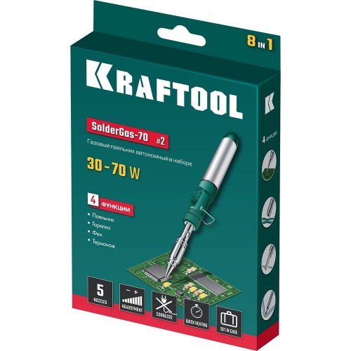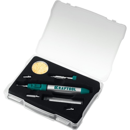 Газовый паяльник Kraftool 55504-H8, предназначен для плавки и сварки пластиковых частей, нагрева малых металлических частей и плавки металла с низкой температурой плавления, ремонта ювелирных изделий, сгибания тонких стеклянных трубок, пайки медных трубок, сварки электронных и электротехнических элементов. Беспроводной паяльник поставляется с 4-мя сменными насадками. Он обладает возможностью выбора температурного режима, что позволяет максимально соответствовать требованиям любой работы. Этот легкий в обращении инструмент, идеально подходит для пайки, выжигания, резки и многих других работ.