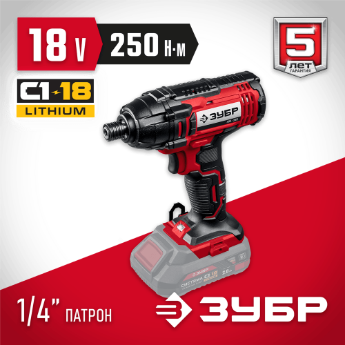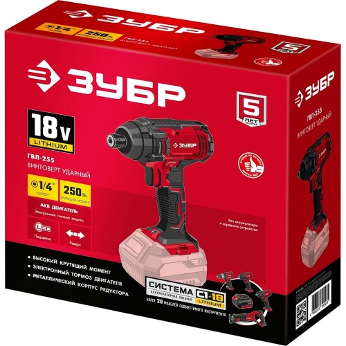 Винтоверт Зубр ГВЛ-255, предназначен для заворачивания/отворачивания крепежа (при сборке/разборке металлических конструкций, снятии/установке колес автомобиля и т.д.). Крутящий момент 250 Нм позволяет использовать его для тяжелых работ в любой области. Аккумуляторный винтоверт имеет единую аккумуляторную платформу С1 18 В для множества инструментов. Преимущества: большой крутящий момент, наличие ударной функции, металлический корпус редуктора, что обеспечивает прочность при передаче большого крутящего момента, патрон HEX 1/4" (стандартные биты и фиксация их в патроне). Подсветка рабочего места способствует дополнительному удобству в условиях недостаточного освещения.
