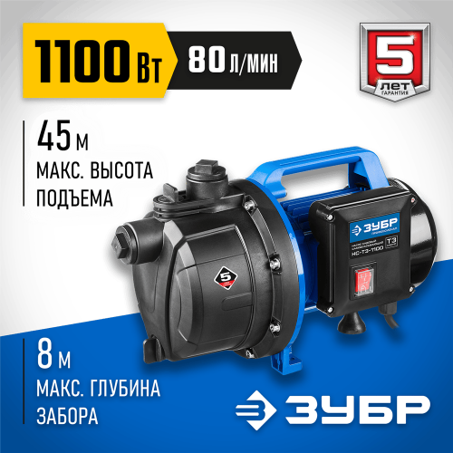 Насос Т3 садовый поверхностный ЗУБР НС-Т3-1100, применяется для перекачивания воды на садовых участках при осушении емкостей и водоемов, организации забора воды с глубины (колодцы, скважины) и подачи на высоту, использовании в системах аэрации и дренажа в течение ограниченного периода времени. Высокая мощность всасывания и способность выдерживать высокое давление, термопредохранитель для защиты двигателя, высокие эксплуатационные свойства делают насос идеальным инструментом при осушении емкостей и водоемов, организации забора воды из колодца и подачи на высоту. Для увеличения срока службы насоса используются материалы только высокого качества. П Двигатель с увеличенным ресурсом и медной обмоткой способствует работе в интенсивном режиме на протяжении более 5 лет. Однофазный двигатель имеет защиту от перегрузки. Может стать основой насосной станции (при комплектации баком и выключателем давления). Влагозащищенный выключатель. Предусмотрена удобная ручка для переноски агрегата.