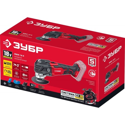Реноватор аккумуляторный с набором насадок и без АКБ ЗУБР МФИ-18 Н, предназначен для резки, пилки, шлифовки заготовок из дерева, металла, керамики, пластика и т.д. Электронная регулировка частоты колебаний позволяет подобрать оптимальный режим для каждого вида работы и материалов. Патрон универсальной системы QOIS с бесключевой фиксацией. Двойной светодиод подсветки для работы в условиях ограниченного освещения. Мягкие накладки на корпусе позволяют надежно удерживать изделие в работе при любом хвате. Единая