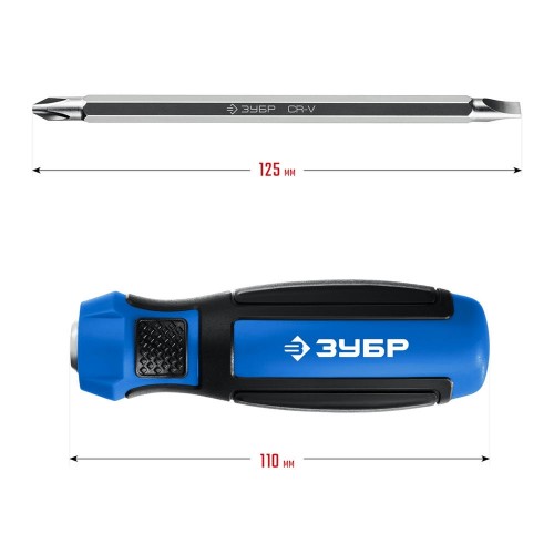 Переставная отвертка Зубр 25029, предназначена для монтажа и демонтажа резьбовых соединений. Стержень изготовлен из высокопрочной хромованадиевой стали. Металлический держатель надежно удерживает стержень внутри рукоятки. Твердость шлица превышает требования ГОСТ. Мощная двухкомпонентная рукоятка обеспечивает надежный и комфортный хват.