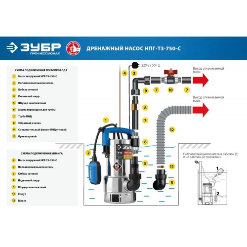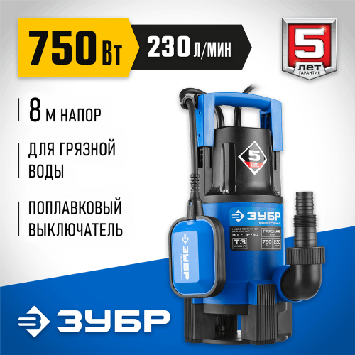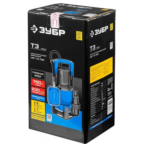 Насос дренажный погружной для грязной воды ЗУБР НПГ-Т3-750, предназначен для перекачивания загрязнённой воды на садовых участках, при осушении ёмкостей и водоёмов, организации забора воды с глубины (колодцы, скважины) и подачи на высоту при использовании в системах аэрации и дренажа. Высокое качество материалов и комплектующих гарантируют стабильность работы и длительный срок службы. Поплавковый выключатель обеспечивает автоматическое включения и выключения при изменении уровня воды. Регулировка уровней включения и выключения насоса. Термопредохранитель для защиты от перегрева. Допускаемый размер частиц включения - до 35 мм. Кабель длиной 10 м, который может использоваться даже на большой глубине.