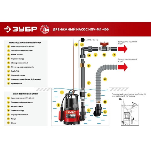Насос погружной дренажный для чистой воды НПЧ-М1-250, предназначен для защиты двигателя, высокие эксплуатационные свойства и простая конструкция обеспечивают надёжное и безопасное применение для перекачивания чистой и загрязнённой воды на садовых участках, при осушении ёмкостей и водоёмов, организации забора воды с глубины (колодцы, скважины) и подачи на высоту, использовании в системах аэрации и дренажа. Имеется автоматическое включение и выключение. Ударопрочный корпус насоса изготовлен из гигиенического армированного стекловолокном пластика. Поплавковый выключатель обеспечивает автоматическое вкл/выкл при изменении уровня воды. Регулировка уровней вкл/выкл насоса. Термопредохранитель для защиты от перегрева. Универсальный соединительный штуцер от 1'' до 1 1/4''.