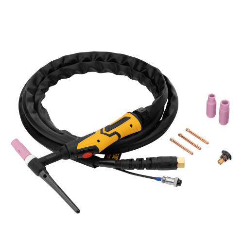 Сварочная горелка Denzel TIG WP26 93644 с рукавом длиной 3 м и управляющим разъемом на 2 пина используется для аргонодуговой сварки неплавящимся электродом диаметром 1-4 мм. Максимальная величина постоянного сварочного тока составляет 180 A, переменного — 150 A. Горелка подходит для работы со сталями и цветными металлами, в т.ч. алюминием.